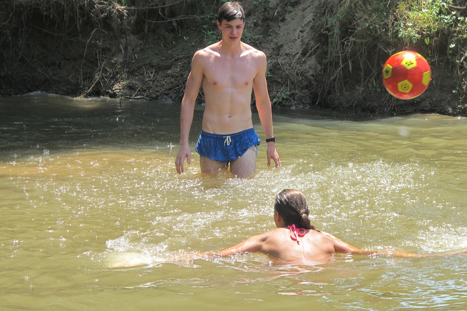 Me metí en el agua y sentí el olvidado frío de la naturaleza. Un corro de helpers y de niños del país, jugamos al balón en el agua. Sólo me falto tirarme desde una liana o desde una rama de árbol a 5 m de altura. Me sentía joven y con ganas de de hacerme un par de bombas en el agua, pero mi debilidad de oídos me hizo frenar el impulso.