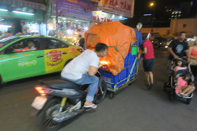 Nos vimos sorprendidos por una curiosa operación. Al atardecer, se bloquea toda una calle con contenedores para montar un amplio mercado callejero. A la señal de un policía, una horda de motoristas, transporta en media hora toda la mercancía sobre ruedas. Vale empujar o tirar de la mercancía a pié descalzo desde la moto, si es preciso. Media hora más tarde, han montado y puesto en marcha, tiendas, restaurantes callejeros y otras muchas actividades comerciales. Simplemente, locura y eficacia; eso sí, sin seguridad.