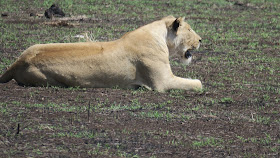 Una leona herida se refugió junto a nuestro vehículo. Tenía una fuerte contusión en el anca derecha. La ausencia de desgarro, inducía a pensar en un golpe, probablemente de un búfalo que se defendió de su ataque. Sangraba y estaba conmocionada. No parecía tener rotura ósea, en cuyo caso, moriría